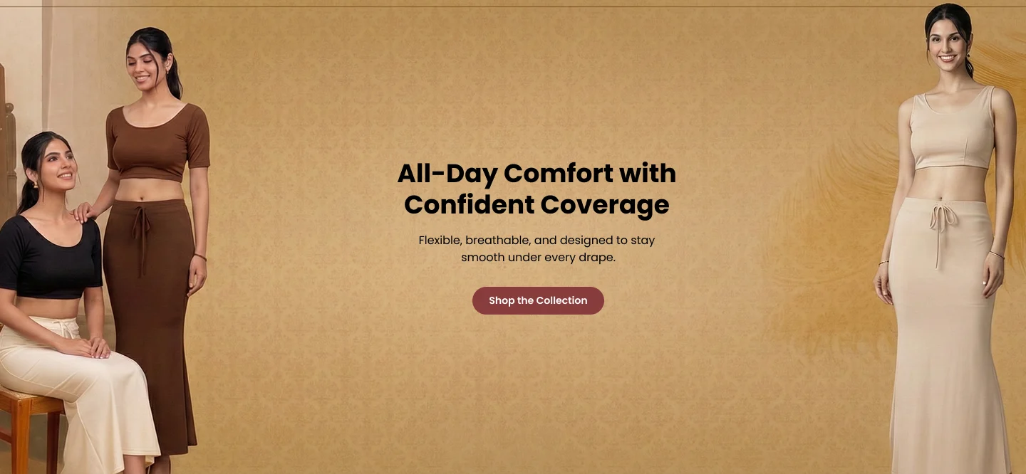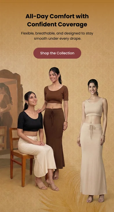 • Comfort-Focused Smart Design having concealed adjustable waistband, smooth seam placement (no chafing), and Sleek fall under sarees, Makes legs look longer & slimmer.