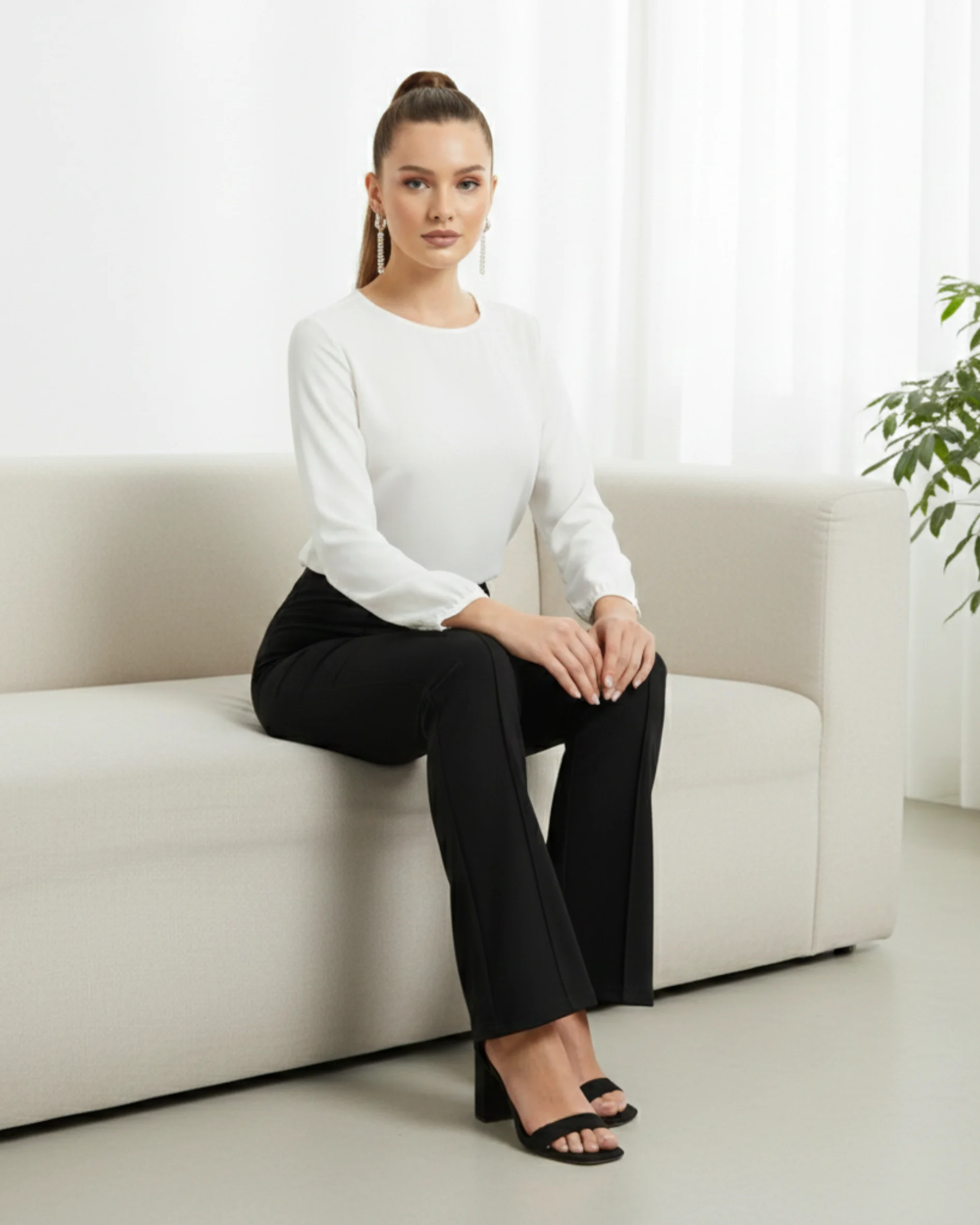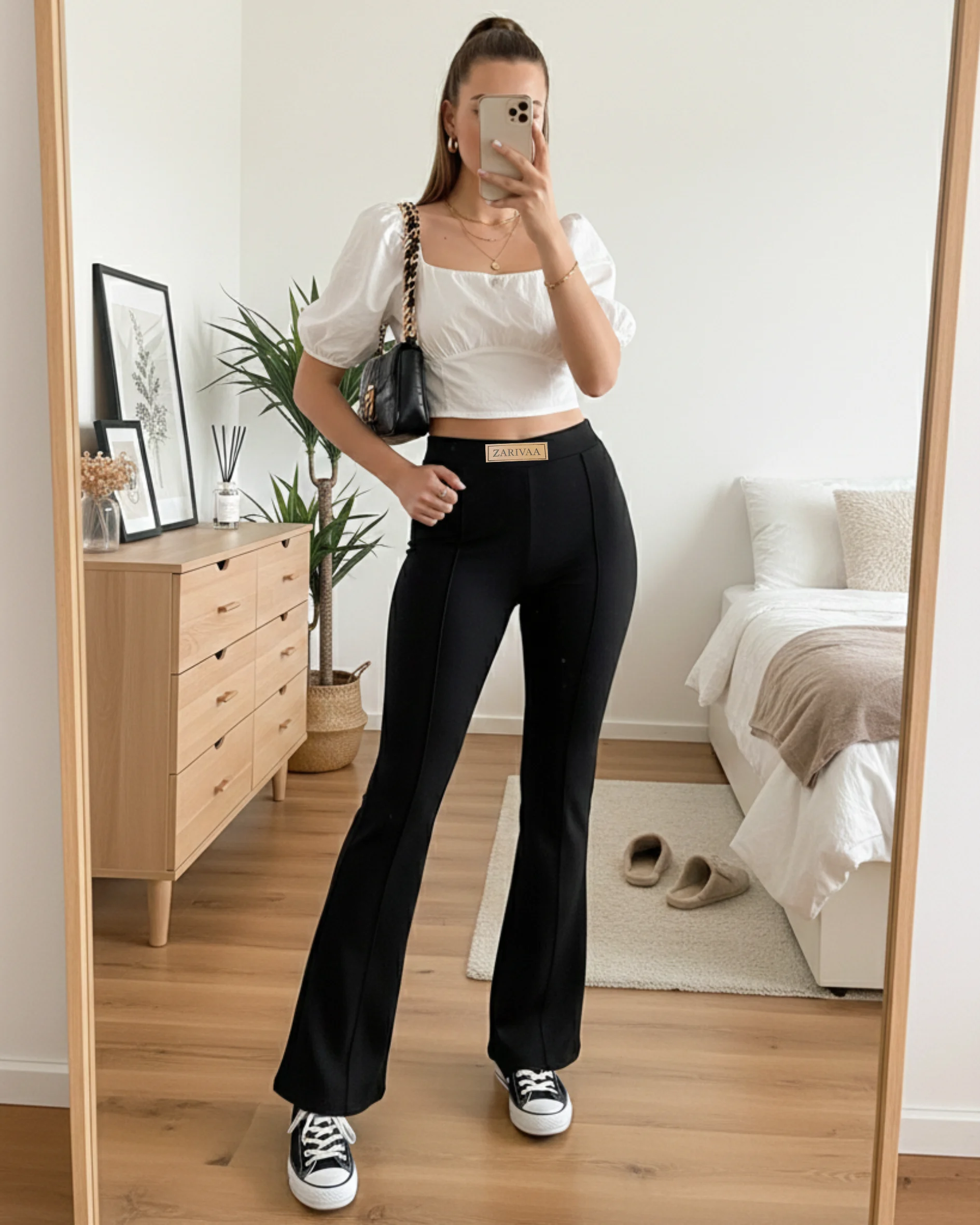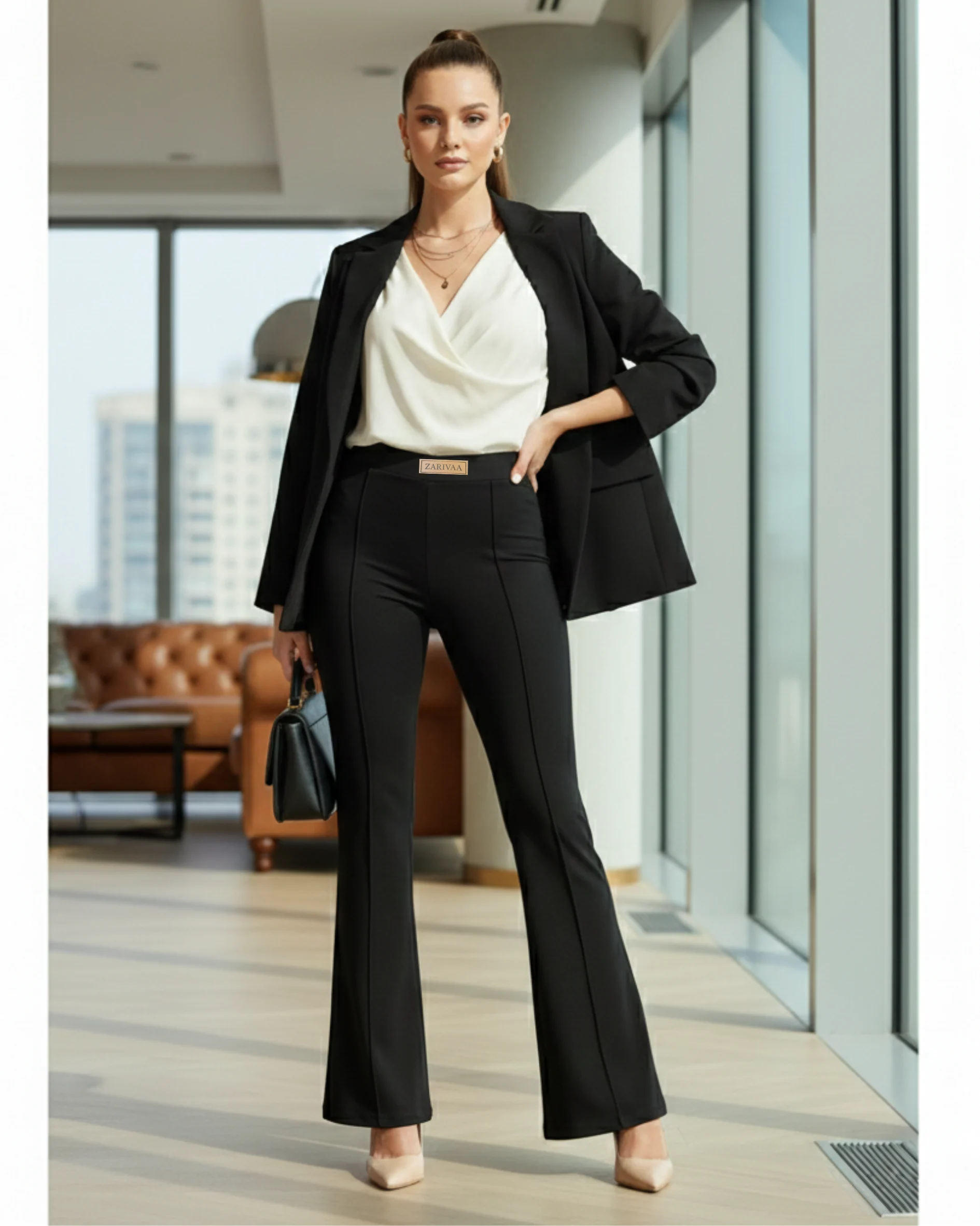 These Zarivaa Bootcut pants are designed for women who want comfort, a good fit, and a clean, stylish look they can wear all day. Made for everyday use, these Flare pants work well for office, travel, light yoga, and daily wear. These high waisted Comfortable Pants are made from 96% cotton blend Lycra, giving a soft and breathable feel. The fabric stretches easily, making them Perfect stretchable pants for women that stay comfortable from morning to night while keeping their shape after repeated wear. The bootcut parallel design helps create a longer and slimmer appearance, making them great pants to look taller. The neat front line design, inspired by pintuck style trousers, gives a smart and polished look. This makes them suitable as formal trousers for women, office wear stretchable pants, and corporate wear trousers for everyday work. For better comfort, these pants with adjustable waist come with an inner drawstring, allowing you to adjust the fit easily. The seamless design gives a smooth finish, making them ideal to wear with fitted tops, shirts, and blazers . These work wear flare trousers can also be used as comfortable travel pants for women and yoga flare pants with drawstring for relaxed movement. The classic Slight flare shape makes them a popular choice among women who like bell bottom pants and stylish parallel pants. Simple, flattering, and easy to wear, these figure flattering trousers are made for women who want everyday comfort without giving up style.