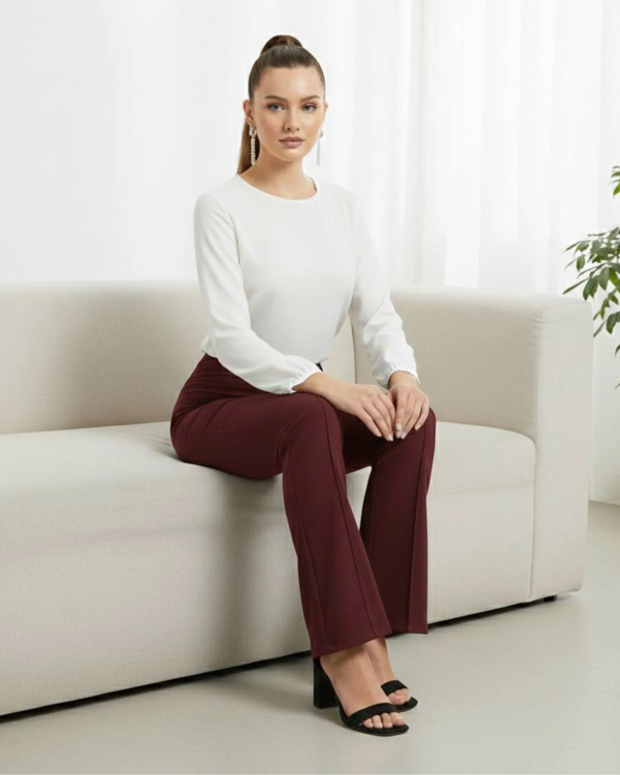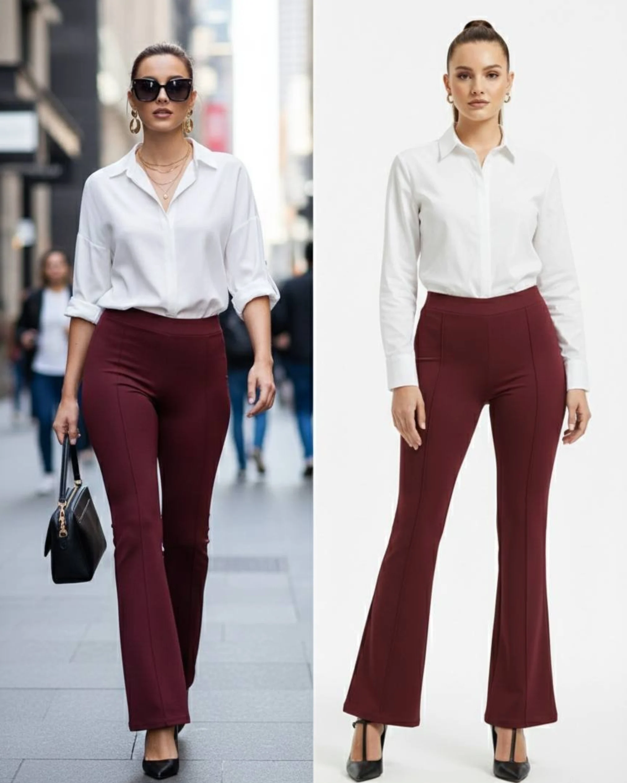 These Zarivaa Bootcut pants are designed for women who want comfort, a good fit, and a clean, stylish look they can wear all day. Made for everyday use, these Flare pants work well for office, travel, light yoga, and daily wear. These high waisted Comfortable Pants are made from 96% cotton blend Lycra, giving a soft and breathable feel. The fabric stretches easily, making them Perfect stretchable pants for women that stay comfortable from morning to night while keeping their shape after repeated wear. The bootcut parallel design helps create a longer and slimmer appearance, making them great pants to look taller. The neat front line design, inspired by pintuck style trousers, gives a smart and polished look. This makes them suitable as formal trousers for women, office wear stretchable pants, and corporate wear trousers for everyday work. For better comfort, these pants with adjustable waist come with an inner drawstring, allowing you to adjust the fit easily. The seamless design gives a smooth finish, making them ideal to wear with fitted tops, shirts, and blazers . These work wear flare trousers can also be used as comfortable travel pants for women and yoga flare pants with drawstring for relaxed movement. The classic Slight flare shape makes them a popular choice among women who like bell bottom pants and stylish parallel pants. Simple, flattering, and easy to wear, these figure flattering trousers are made for women who want everyday comfort without giving up style.