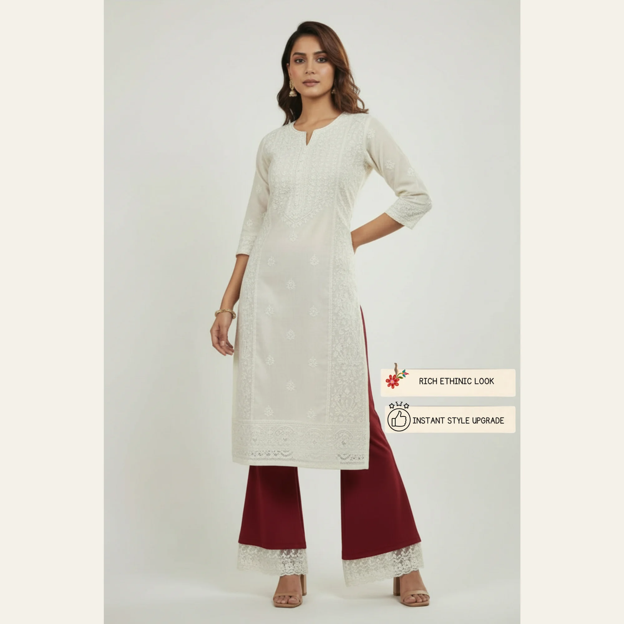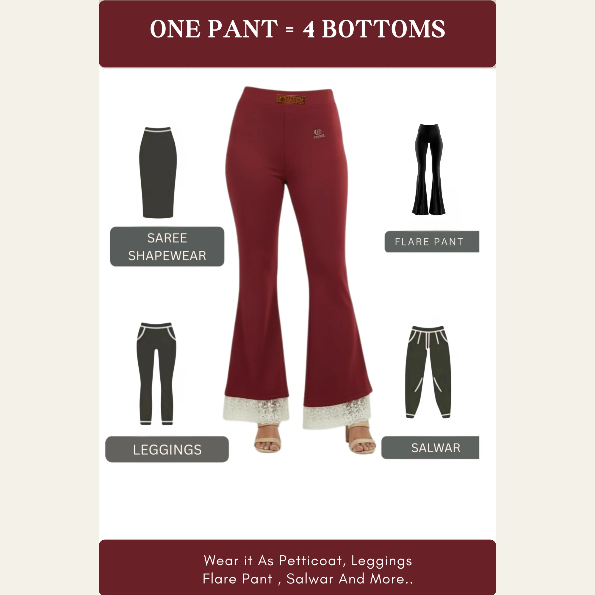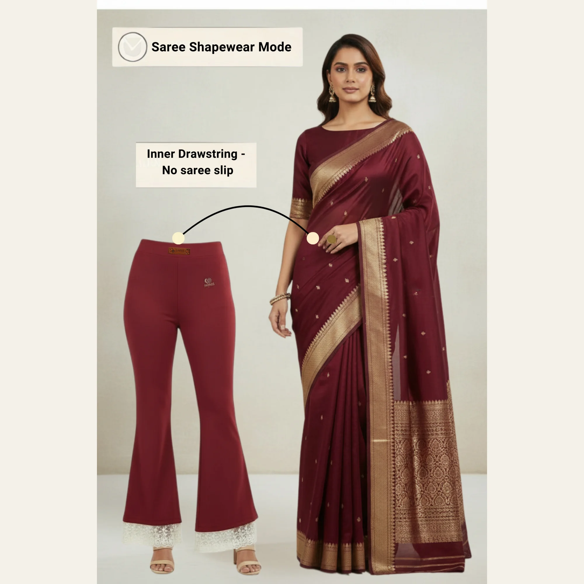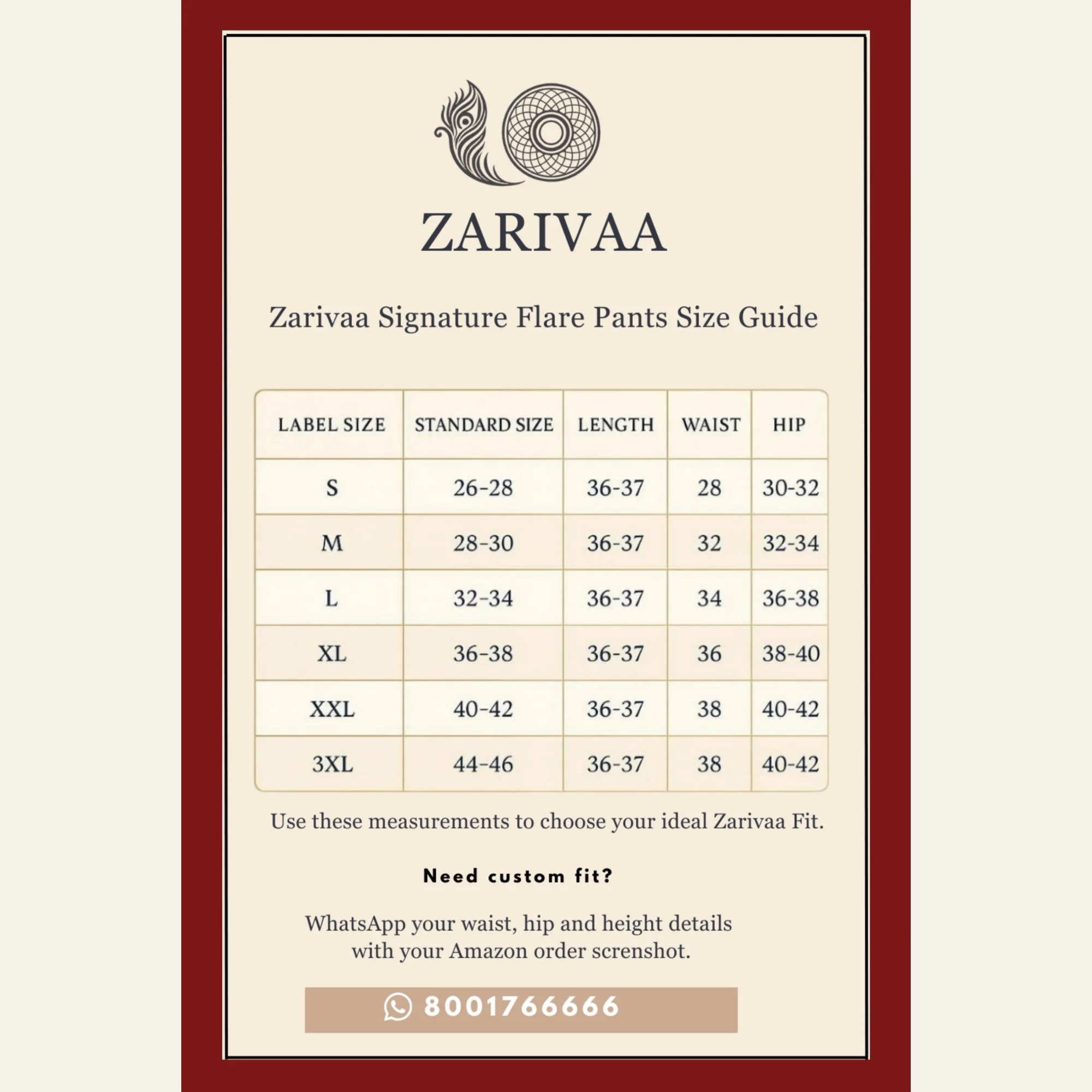 The premium 4‑way stretch lycra feels soft and flexible, gently shaping your tummy, hips and thighs for all‑day confidence. Wear it at home, to the office, while traveling or for casual outings and functions—it always looks right. The high‑waist flare fit smooths your silhouette and pairs easily with a T‑shirt, kurti, shirt, saree, denim jacket or blazer. One Zarivaa Signature Flare Pant can replace your saree shapewear, leggings, yoga pants, trousers and regular flare pants—one versatile bottom that feels good, looks elegant and works for every occasion.