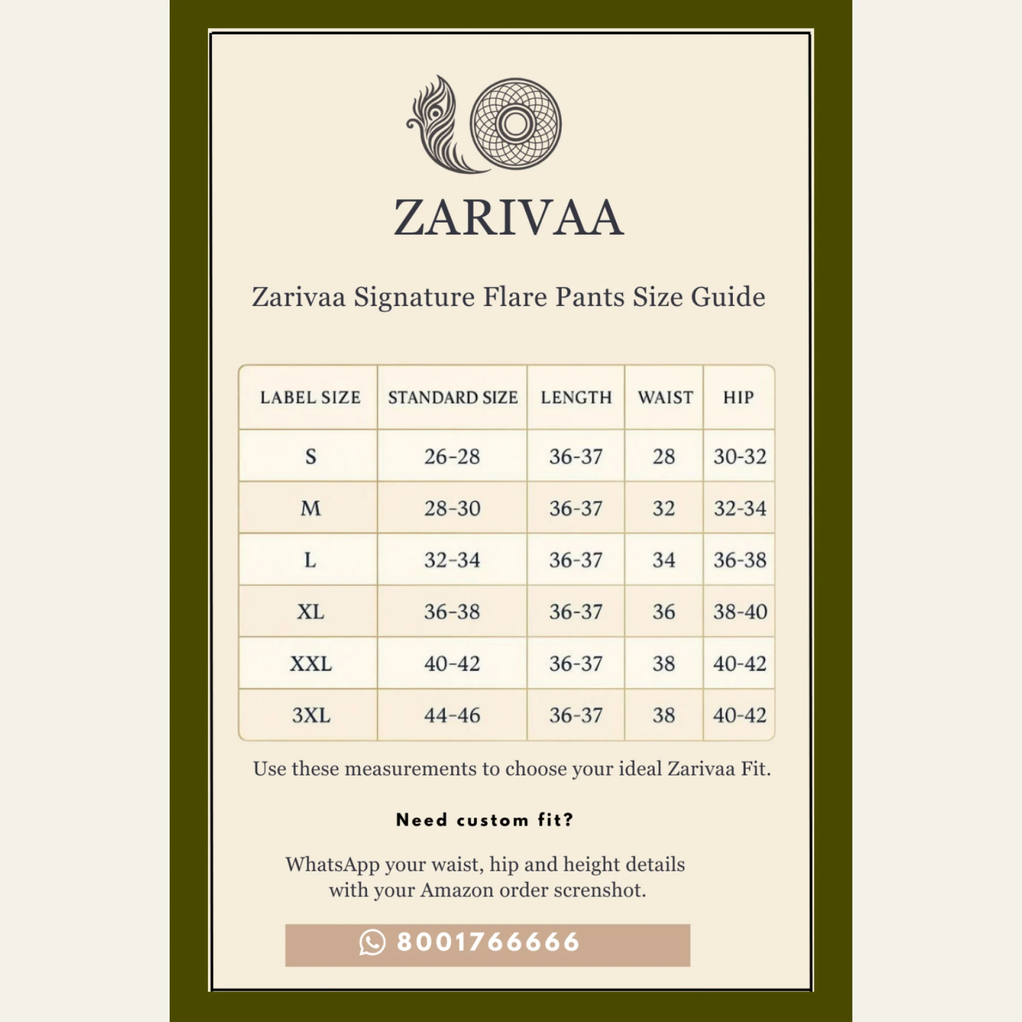 The premium 4‑way stretch lycra feels soft and flexible, gently shaping your tummy, hips and thighs for all‑day confidence. Wear it at home, to the office, while traveling or for casual outings and functions—it always looks right. The high‑waist flare fit smooths your silhouette and pairs easily with a T‑shirt, kurti, shirt, saree, denim jacket or blazer. One Zarivaa Signature Flare Pant can replace your saree shapewear, leggings, yoga pants, trousers and regular flare pants—one versatile bottom that feels good, looks elegant and works for every occasion.